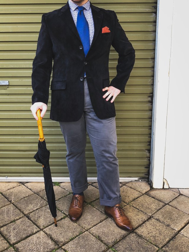 Now I love that outfit, but a discerning eye cannot help picking up the inward slope from my feet up to my knees. That is what is known as a knock knee (regardless of how severe the angle is), and recently a Styleforum member Alan Bee shared about his experience of how a fuller cut trouser helps to avoid showing the knee off. To illustrate, here is a reiteration of the fuller cut trouser I am shown wearing above, as well as another example: