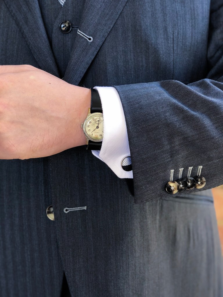 The first outing for my suit occurred last weekend to a long-time friend’s wedding. I paired it with a white herringbone shirt in a larger scale, also custom made by Knightsman. Accessories were a Macclesfield styled tie from Hardy Amies, a vintage Pobeda Red 12 wristwatch and vintage cufflinks. Shoes were my Cheaney Kelmarsh brogues.